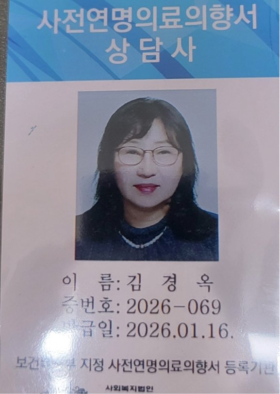 "사전연명의료의향서" 자격 취득함 작성자관리자 등록일 26-03-16 조회12회 본문 (사)한국방문간호사회에서 주최한 "사전연명의료의향서" 2025년 11월 22일부터 교육 수료후 자격증을 발급 받았습니다 방문간호 서비스 목록